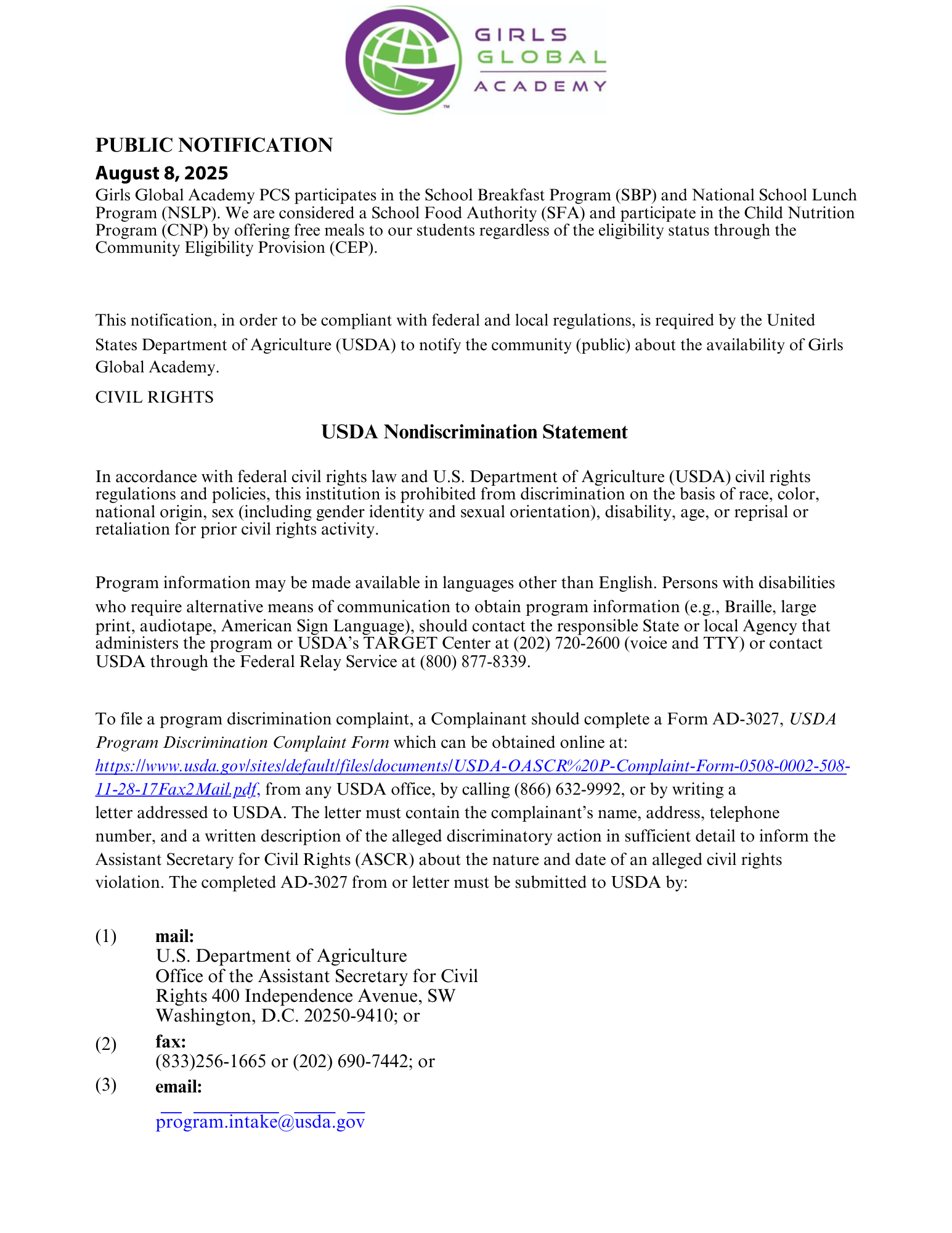 Girls Global Academy PCS participates in the School Breakfast Program (SBP) and National School Lunch Program (NSLP). We are considered a School Food Authority (SFA) and participate in the Child Nutrition Program (CNP) by offering free meals to our students regardless of the eligibility status through the community Eligibility Provision (CEP).This notification, in order to be compliant with federal and local regulations, is required by the United States Department of Agriculture (USDA) to notify the community (public) about the availability of Girls Global Academy.